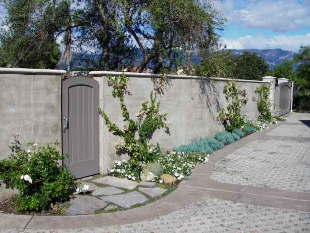 field-grown Olive trees ringed with Santa Barbara sandstone planters grace